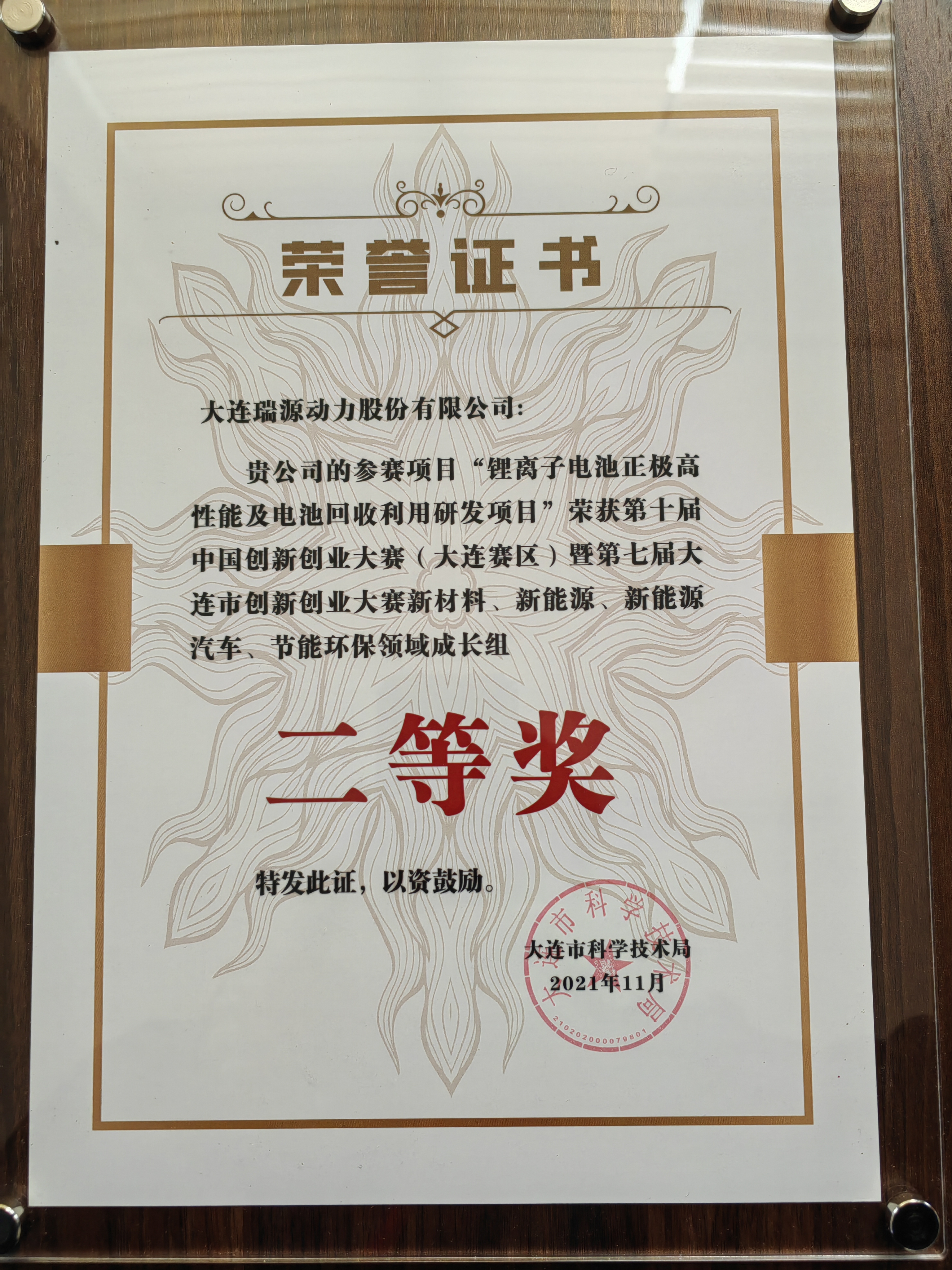 大連瑞源動力股份有限公司參賽中國創(chuàng)新創(chuàng)業(yè)大賽并榮獲第二名